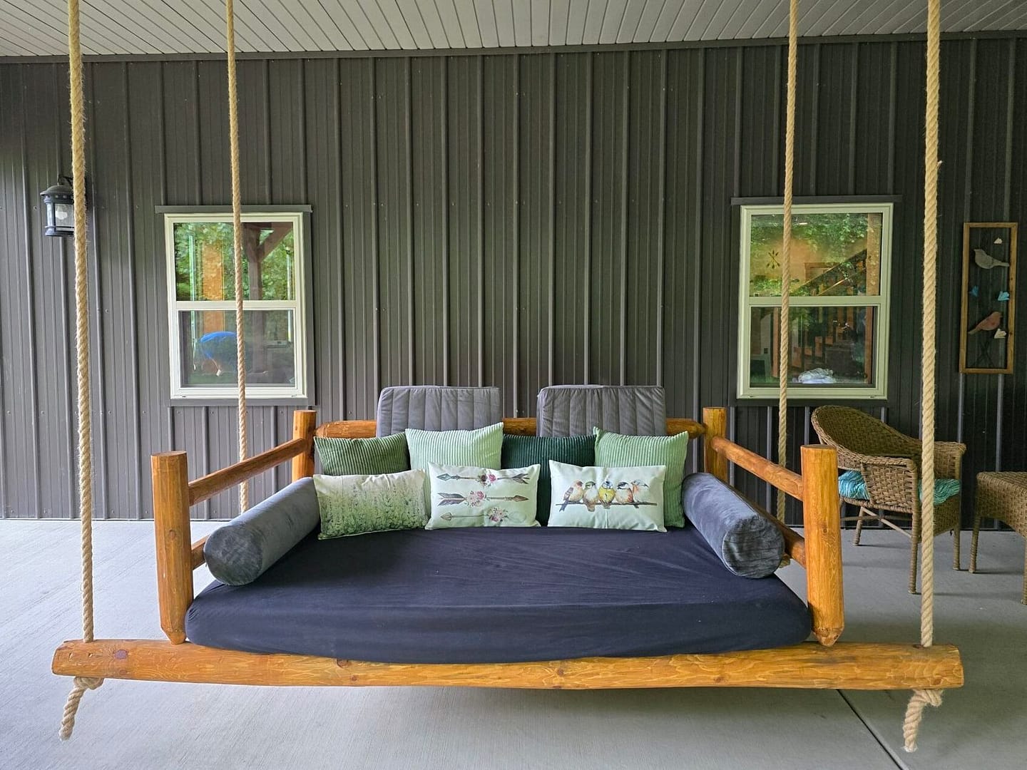 This past summer, we had a longtime dream come true: the addition of a handcrafted daybed swing. Built with a rustic wooden frame and suspended with natural jute rope, it hangs beneath the covered porch. Guests use it as their morning retreat with their coffee and Bible in hand, a spot to birdwatch in the stillness, or an afternoon nap nook where the swing’s sway makes it impossible not to relax. By evening, it transforms into a gathering place for conversation, laughter, and storytelling.