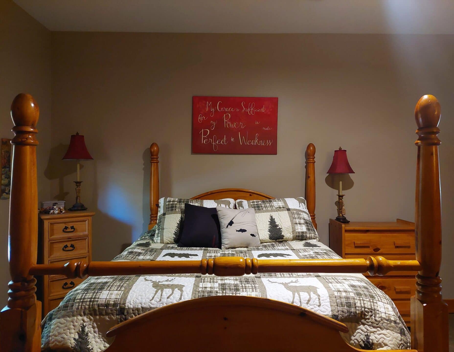 There are two bedrooms on the main floor and two upstairs. On the ground floor the large private master bedroom is complete with a large pine log bed and private attached bathroom. There is another bedroom off of the kitchenette with a private bathroom. The remaining two bedrooms are located up the timber staircase next to the loft.